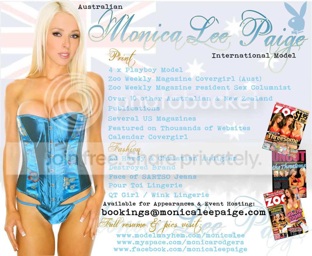 Website Coming Soon - http://www.monicaleepaige.com NEWS::::::::::::::::::NEWS:::::::::::::::::::NEWS DECEMBER 2010 (All Australian Summer) Girls of ZOO Special Summer Edition, Cover Pic & 4 page feature...OUT NOW ZOO Weekly Website Gallery - "Monica's Bedroom" Babe of the Day http://www.zooweekly.com.au/girls/galleries/monicas-bedroom.htm August 2010 - Girls of ZOO Special Edition Uncut - 4 page feature OUT NOW - Ranked #52 in 'The Worlds Hottest Women of 2010' Zoo Weekly Magazine Feb 15 Out now. Covergirl for the 1st issue of ZOO Weekly Magazine in 2010! (Australia & New Zealand) ZOO Weekly Australia's former (14 Month contract 2009/2010) Sex / Relationship Advice Columnist!!! See tears for more. TOP FRIENDS NOT IN ANY PARTICULAR ORDER I have reasonable rates and depending on the assignment, am very professional, fairly flexible & an extremely hard worker, dedicated to capturing "that image" - Also a budding photographer myself, I love to learn from everyone I work with. TRAVEL NOTICES: