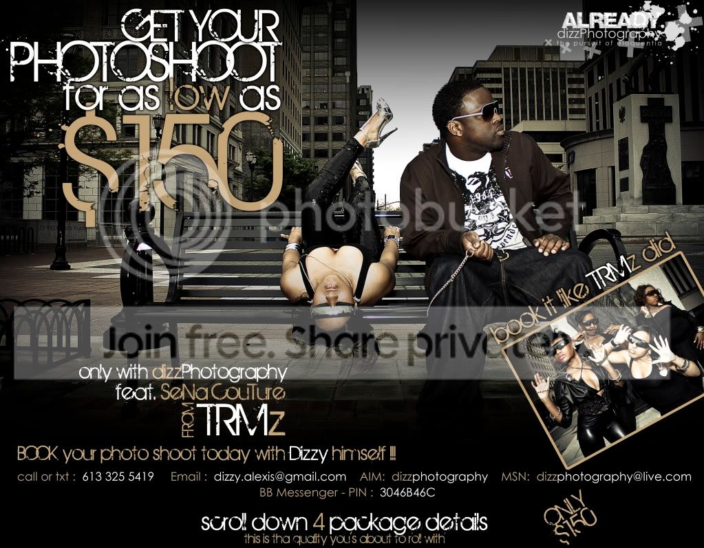 Great Prices, Professional Finish! http://www.myspace.com/dizzphotography BOOK your photo shoot today with Dizzy himself ! And here’s how: Call or Txt: 613 325 5419 Email: dizzy.alexis@gmail.com AIM: dizzphotography MSN: dizzphotography@live.com BB Messenger - PIN: 3046B46C Facebook? You can always add me: http://www.facebook.com/profile.php?id=507875121&ref=profile Verified Credits (0)Worked with dizzPhotography? Share your experience and become verified! Add Credits