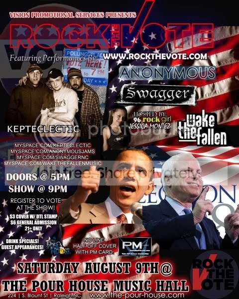 *11/2008 - "Fashion Nouveau" @ The Office in Raleigh, NC. Backstage Manager (I work behind the scenes too!) ~Host: *6/26/09 - "Friday Night Live" @ Deep South, Raleigh, 10 PM. Presented by Vision Promotional Services, NC Local Music & Deep South! *9/2008 - "Women of Rock" showcase for the NC Local Music Benefit Concert for Interact of Wake County @ The Pour House Music Hall - Raleigh, NC *8/9/08 - VPS Rock the Vote Benefit Concert @ The Pour House Music Hall - Raleigh, NC