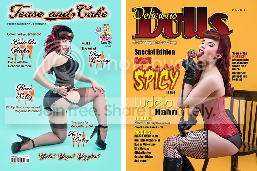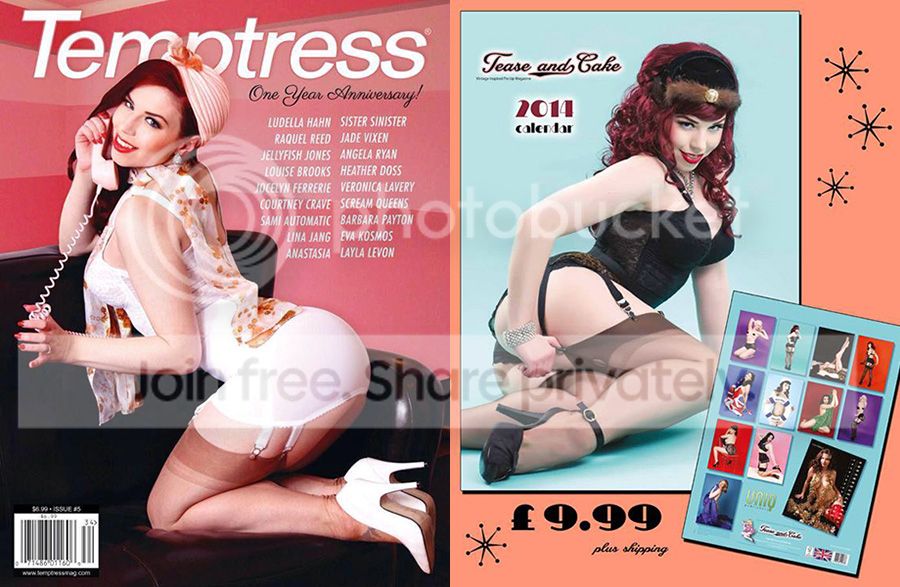 Recent publications shown above...Temptress Magazine Issue 5 cover (on sale in bookstores and newwstands worldwide Dec 9th!), Tease and Cake Magazine's 2014 Calendar cover and Miss February (a size A3 aka GIANT calendar on sale at http://www.onlinecalendarshop.com and http://www.teaseandcake.co.uk), Rat Rod Feb/Mar 2013 cover, Sinical April 2013 cover, Tease and Cake (UK) June 2013 cover, Delicious Dolls Spicy Issue June 2013 cover, Heartbreaker's 2014 Catalog (Fall/Winter), American Classic Magazine December 2013 cover, Retro Lovely Taboo Edition issue 6 cover, and Heartbreaker's 2013 Spring Catalog